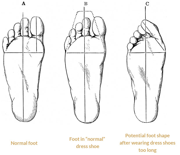 Most dress shoes shoes can wreak havoc on your foot health. They put your toes in a death grip, which can cause bunions, plantar fasciitis, and many other foot problems. They also have heels, which can cause calf shortening, ankle pronation, flat feet, foot pronation, and more.